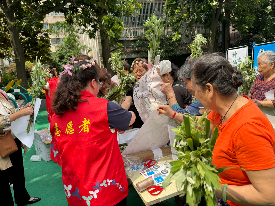 紧接着,制作艾草花束的环节吸引了众多居民的目光。大家纷纷动手,将新鲜的艾草、菖蒲等植物修剪成合适的长度和形状,然后用丝带包裹成一束束散发着自然香气的花束,艾草花束别具一格,蕴含着居民们对端午安康的美好祝愿。