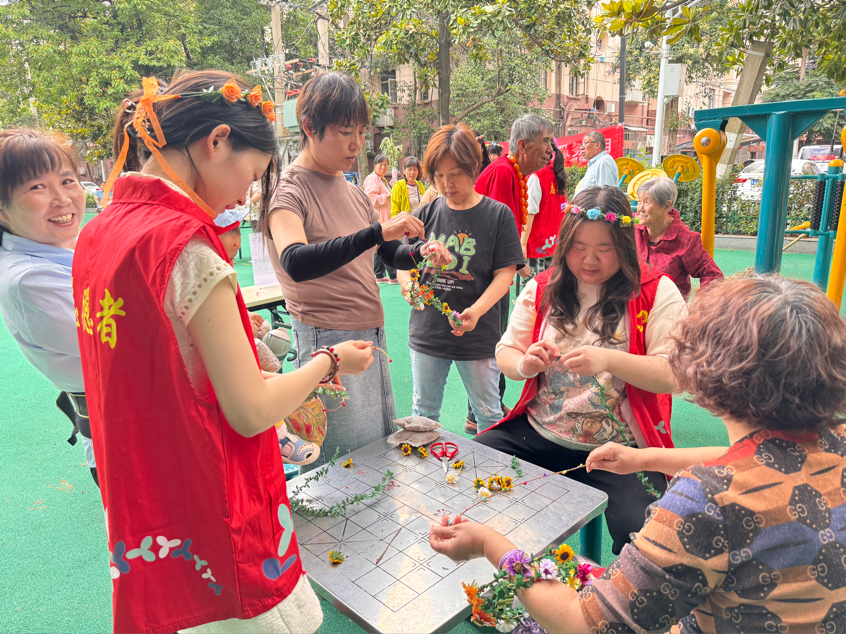 此外,居民们还利用艾草、薄荷、迷迭香等植物,搭配各种装饰品编织出一个个既实用又美观的花环。大家互相交流编织技巧,相互帮助完成作品,场面既热闹又和谐,充分展现了社区大家庭的温暖和团结。