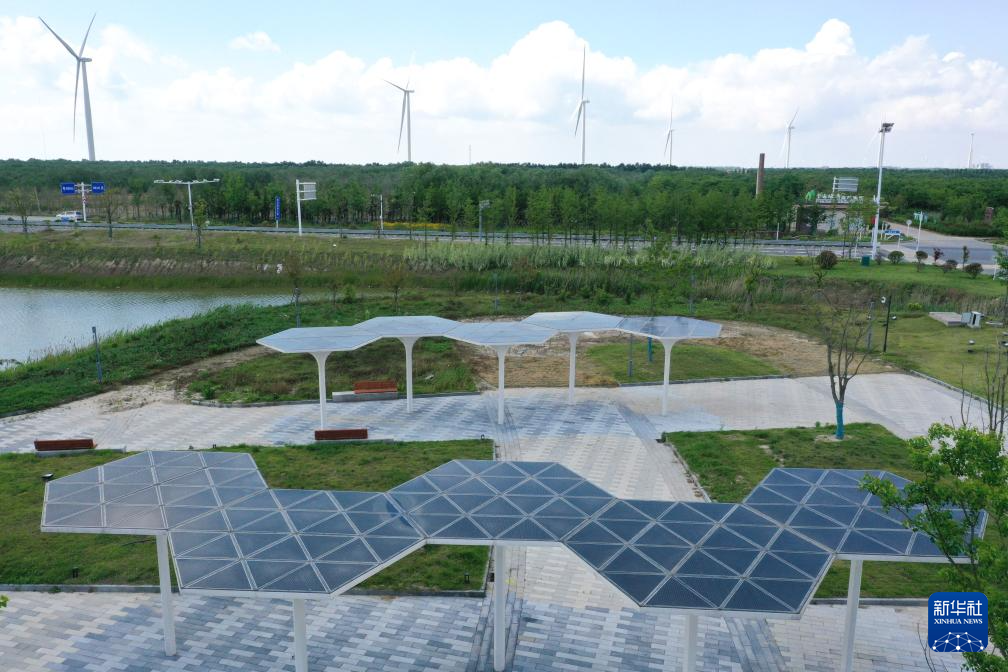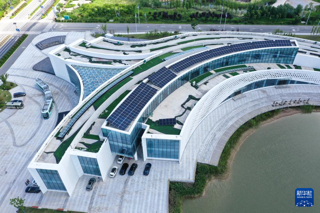 6月6日拍摄的射阳港低(零)碳产业研究院建筑屋顶使用的太阳能光伏电能系统(无人机照片)。新华社记者 杨磊 摄