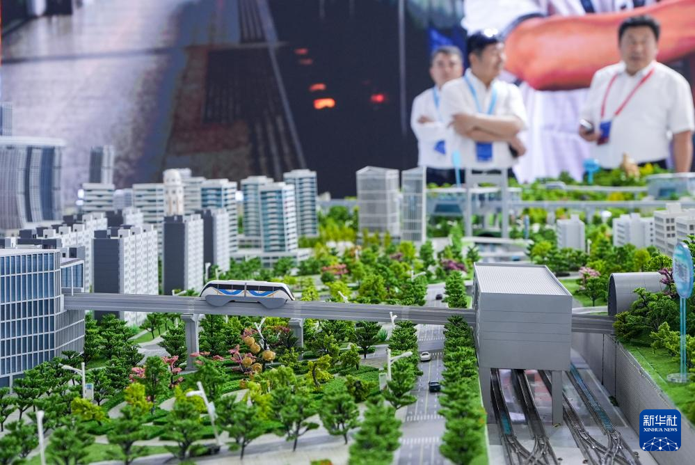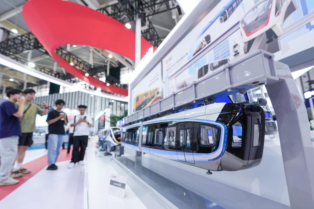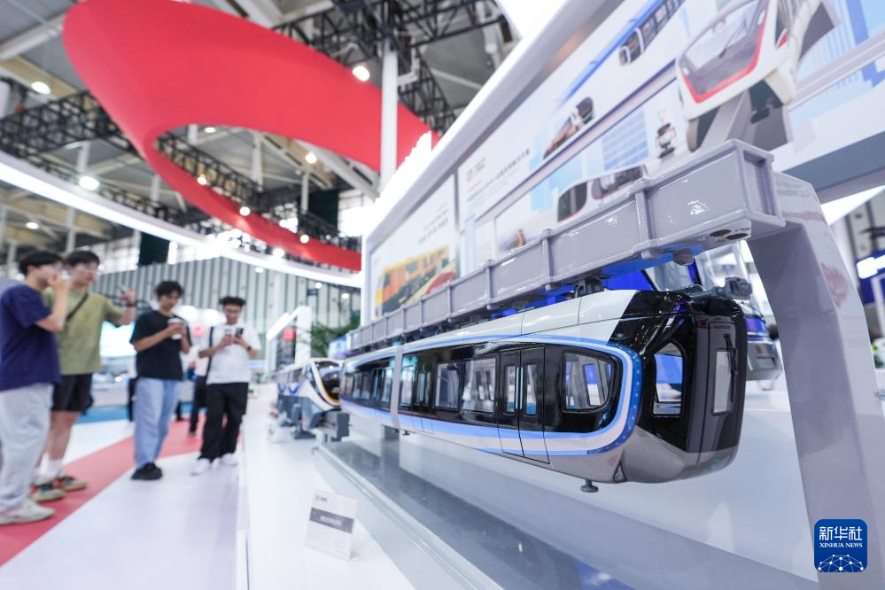 6月13日,观众在中国中车展区参观“悬挂式单轨列车”模型。