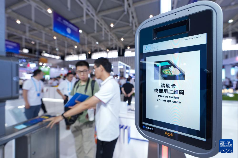 6月13日,工作人员在为观众介绍“3D智能视觉通行检票机”。