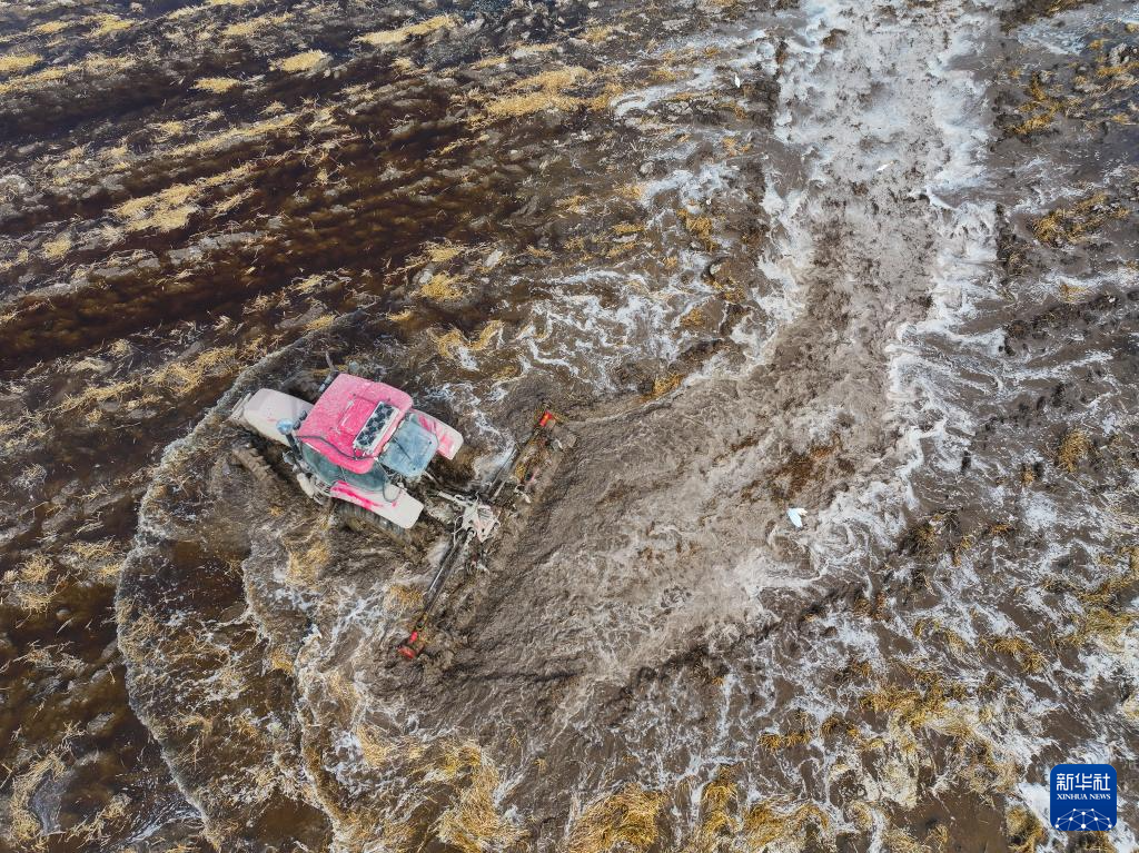 6月18日,农业机械在临海农场一块水田进行起浆作业(无人机照片)。