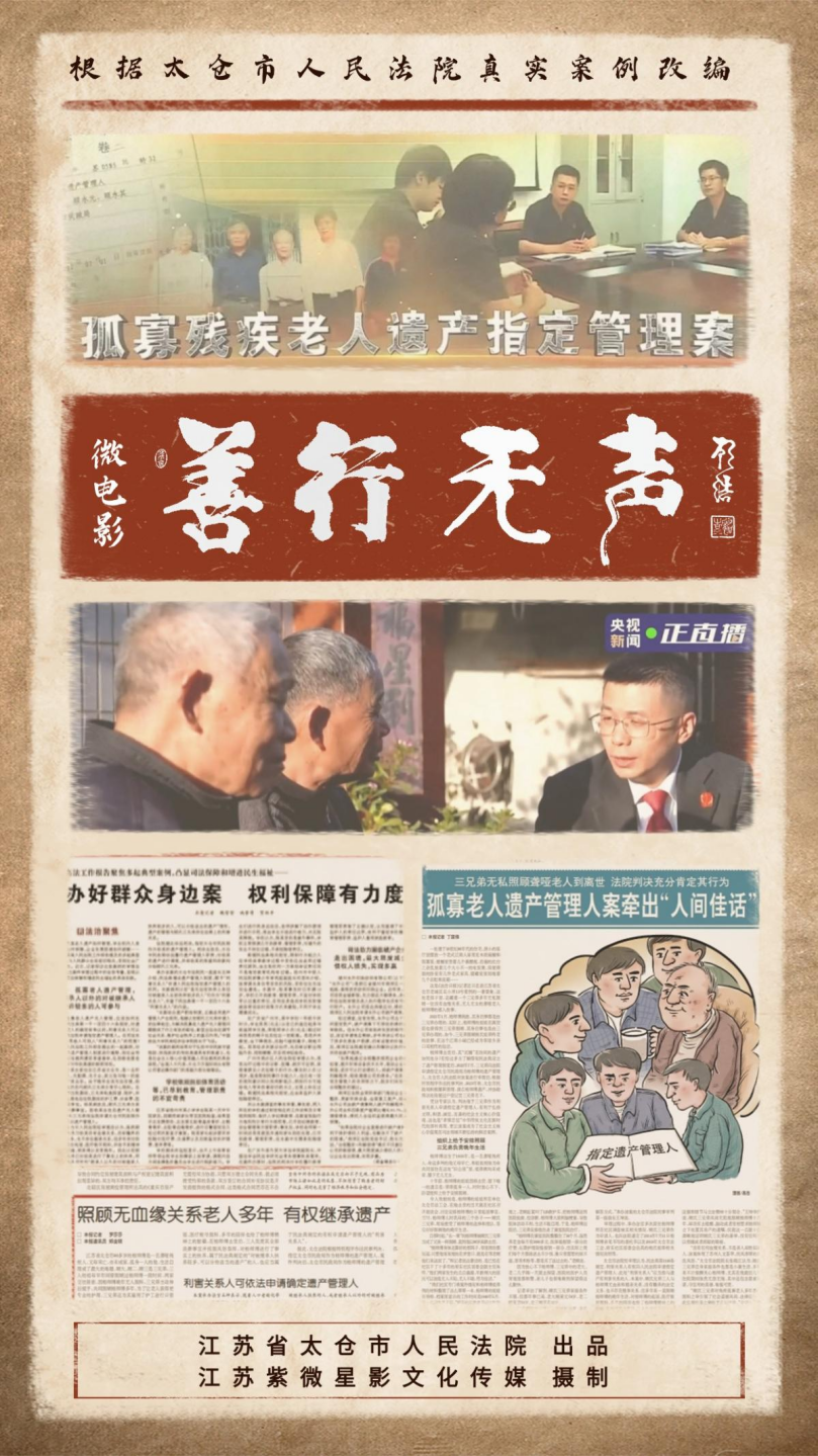 微电影《善行无声》根据太仓市人民法院真实案例改编,影片讲述了太仓法官在审理孤寡老人“遗产管理人”案中创新审判,为解决孤寡老人遗产管理问题提供了有效路径,故事中还体现了太仓顾氏三兄弟对孤寡老人温暖照料的生动细节,呼吁社会各界对老年群体给予更多的关注和支持。