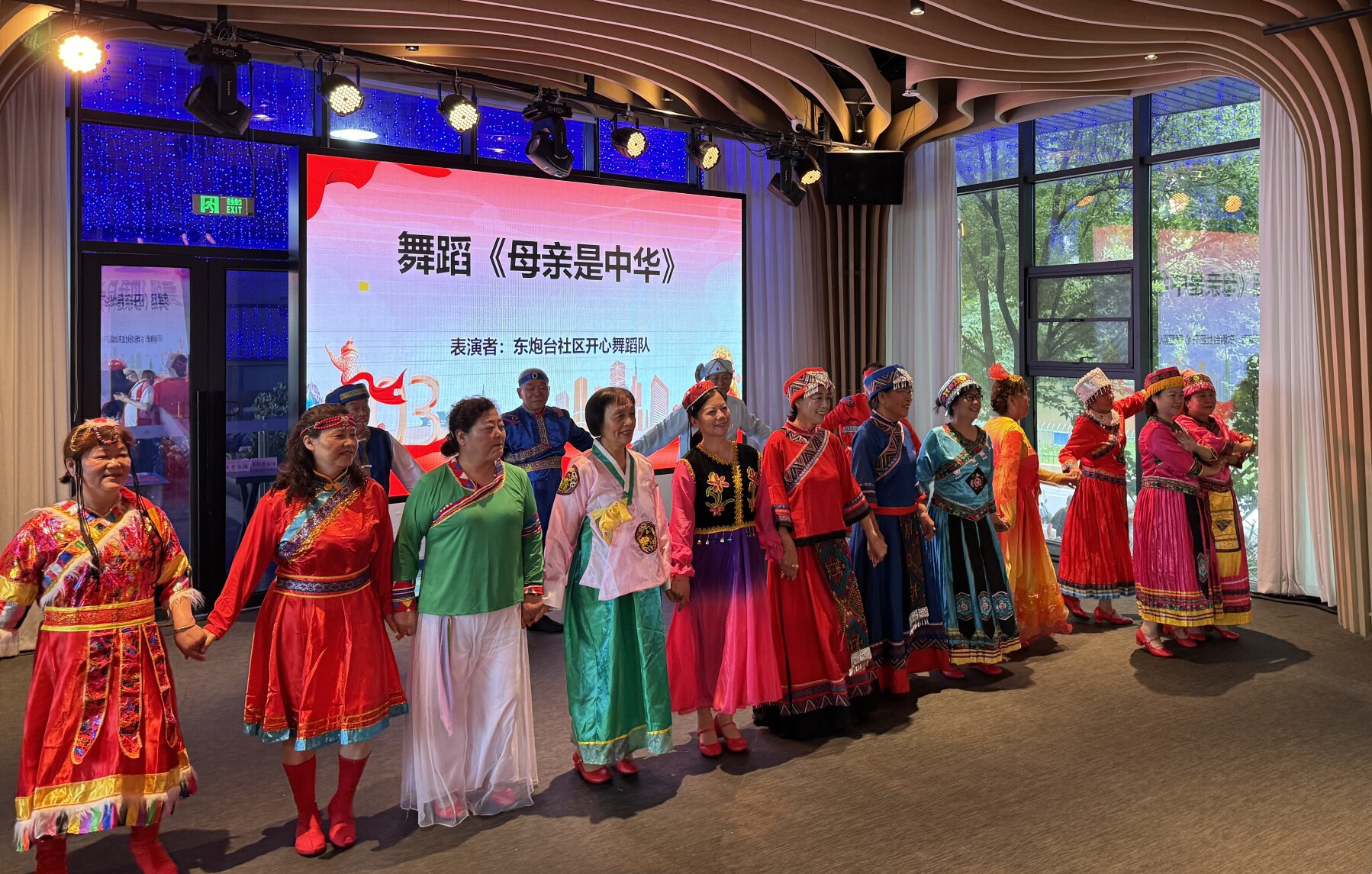 一曲《母亲是中华》为文艺演出拉开了序幕。东炮台社区“开心舞蹈队”的演员们身着鲜艳的民族传统服饰,随着欢快的节奏翩翩起舞,将观众们带入到各民族独特的风情画卷之中。
