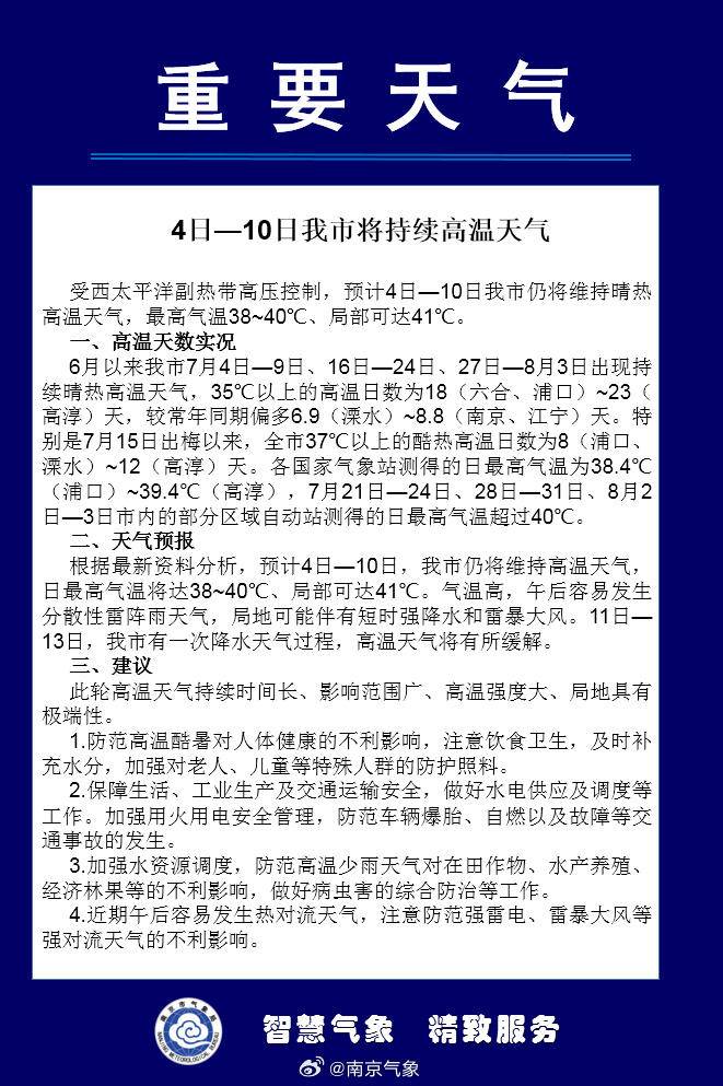 @南京气象 8月4日发布重要天气预报:受西太平洋副热带高压控制预计8月4日到8月10日南京市将持续高温天气最高气温38~40℃、局部可达41℃
