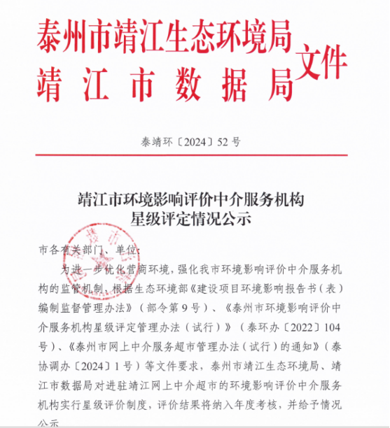 8月12日,由靖江生态环境局、靖江市数据局联合评定的2023年度靖江市环境影响评价服务机构星级评定名单“出炉”,共产生2家四星级单位、16家三星级单位、18家二星级单位、1家一星级单位,另有14家单位被清退出靖江网上中介超市。