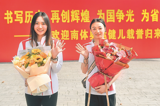 奥运冠军、江苏花样游泳运动员王赐月(左)和奥运冠军、江苏艺术体操运动员郝婷回到江苏。万程鹏 摄