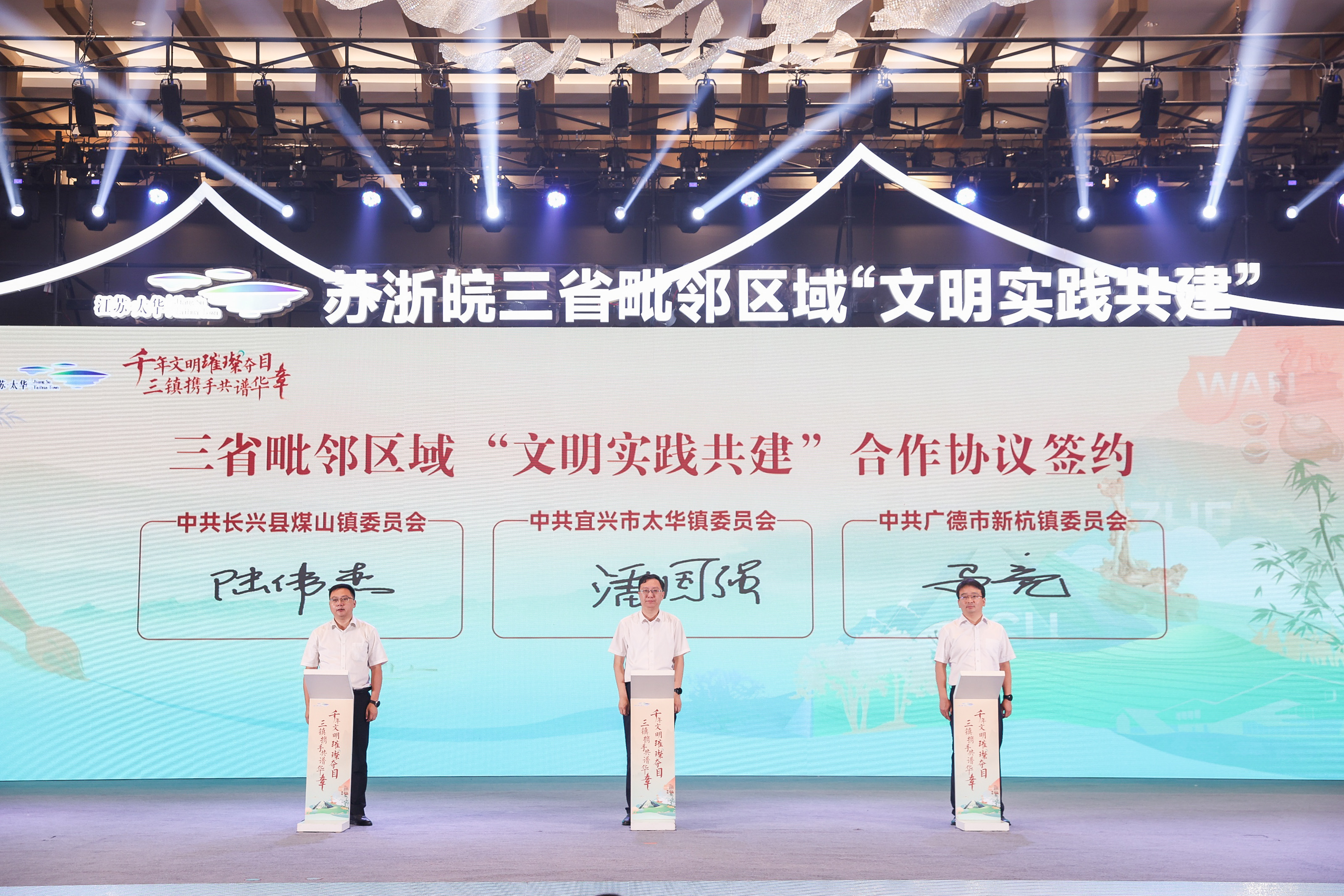 8月20日,苏浙皖三省毗邻区域“文明实践共建”启动仪式在宜兴举行,三省在全国率先尝试以“太华、煤山、新杭”三镇为试点,共同签署《苏浙皖三省毗邻区域文明实践共建合作方案》。