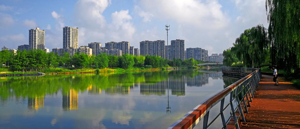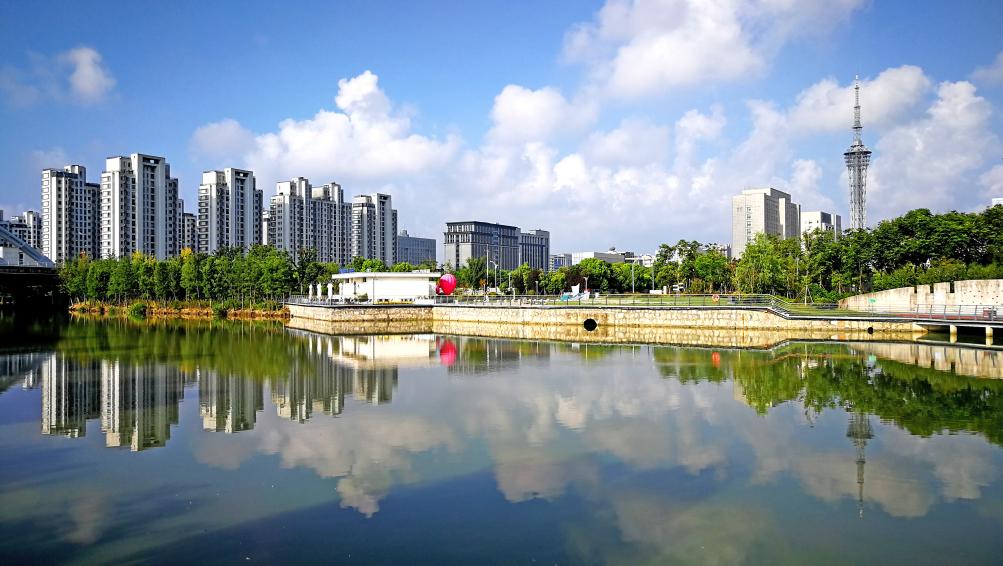 初秋时节,江苏如东掘苴河城区段,河水清澈,白云倒映在水中,构成一道和美的风景线。