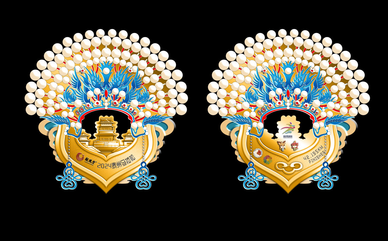 值得一提的是,今年的奖牌采用统一设计,全马、半马、欢乐跑的奖牌并分别以金、银、铜色加以区分。奖牌以京剧花旦头冠作为核心视觉形象,地标建筑望海楼镶嵌在奖牌正面中央,刻画了泰州千年古城的文脉延绵,同时也是泰州“戏曲之乡”的生动展现。