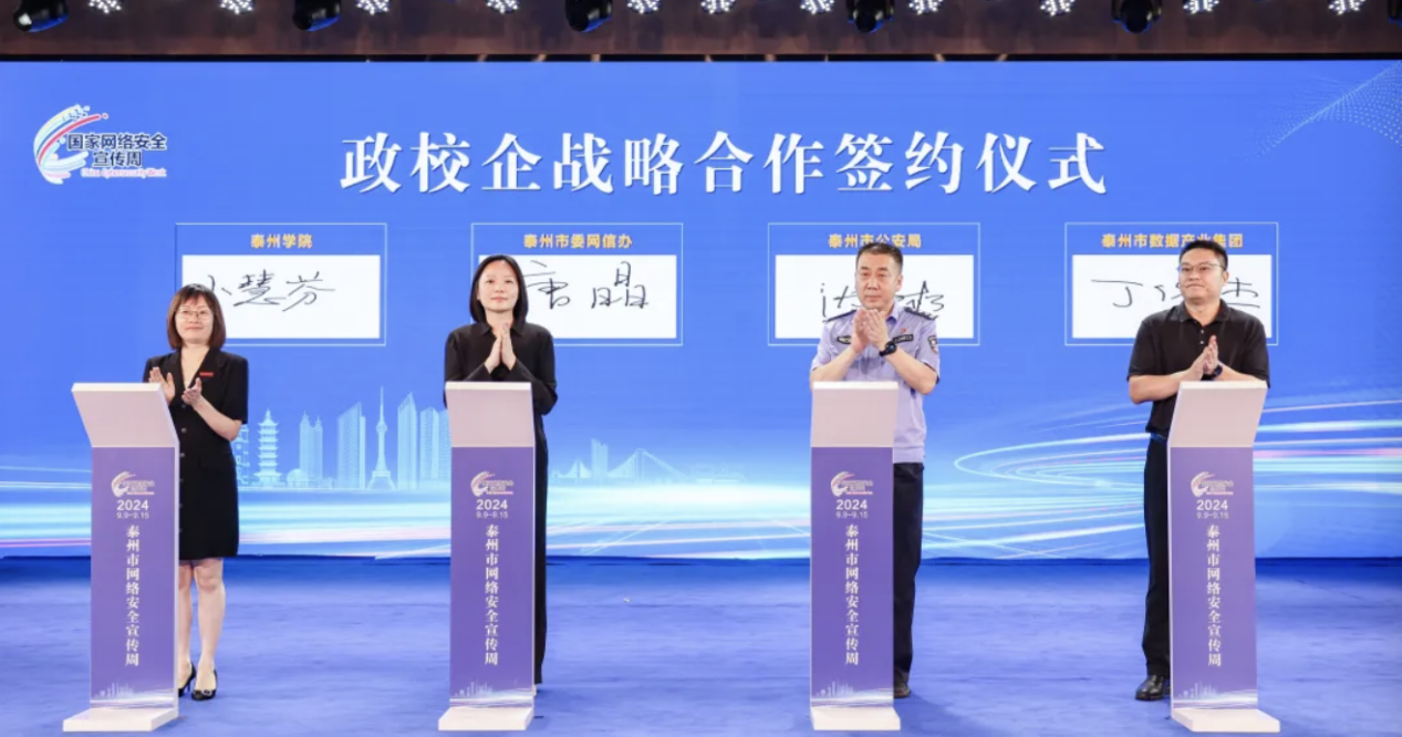 活动现场签署了政校企战略合作协议,表彰了2024年泰州市网络安全知识竞赛获奖代表,发布了2023年泰州市网络数据安全优秀实践案例,泰州学院为3名特聘教授颁发聘书,学生代表宣读了《网络安全倡议书》。