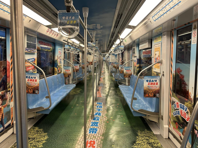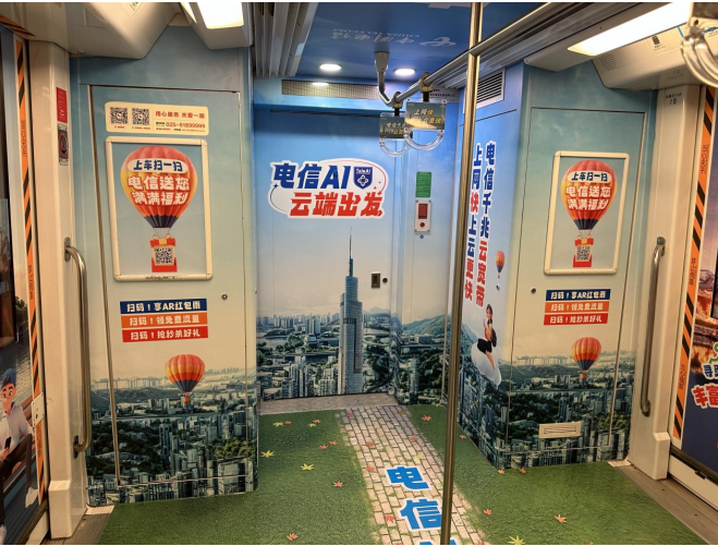 据介绍,此次江苏电信打造的“AI畅游·大美江苏”地铁文旅专列可谓“科技感爆棚”,走进地铁车厢,就仿佛走进了一页干货满满的AI旅游攻略,不仅包罗了南京热门景点,还能认识到5G网络、FTTR千兆云宽带、生活权益以及AI产品等诸多电信业务,让每一位乘客在流动的风景线中,沉浸式体验一场数字生活的奇妙漫游。