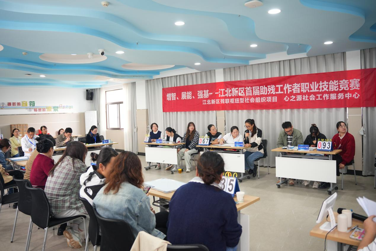 10月16日,南京江北新区在残疾人综合服务中心举办首届助残工作者职业技能竞赛及残疾人职业技能竞赛,20余位来自新区各街道、社区残疾人之家的助残工作者及辖区内60名残障人士齐聚一堂,为爱比拼。江北新区残联康复与教就科科室负责人黄翠霞,江北新区残联就业与培训业务负责人宋春芳,南京信息工程大学法学与公共管理学院共同富裕研究院副院长李志强,高级社会工作师陆云,江苏省民政厅精神障碍社区康复专家委员会成员黄小虎参加活动。