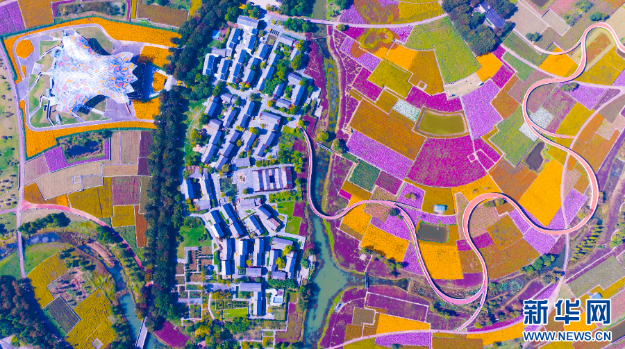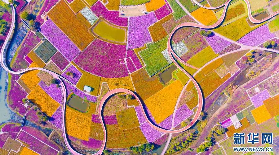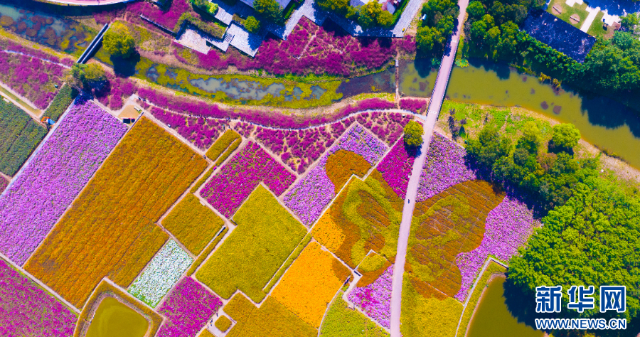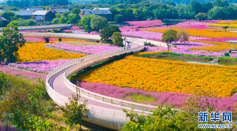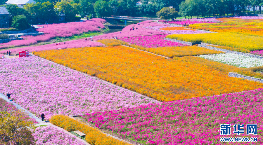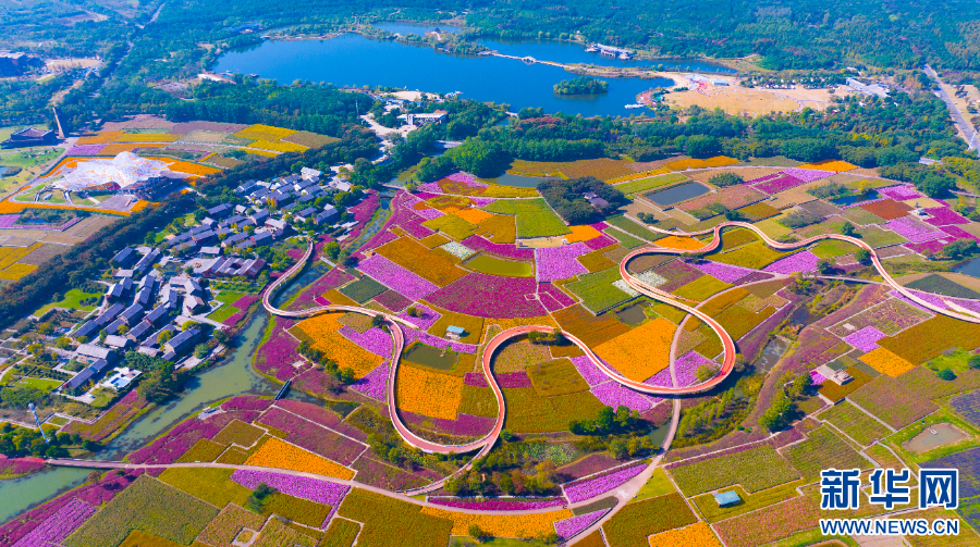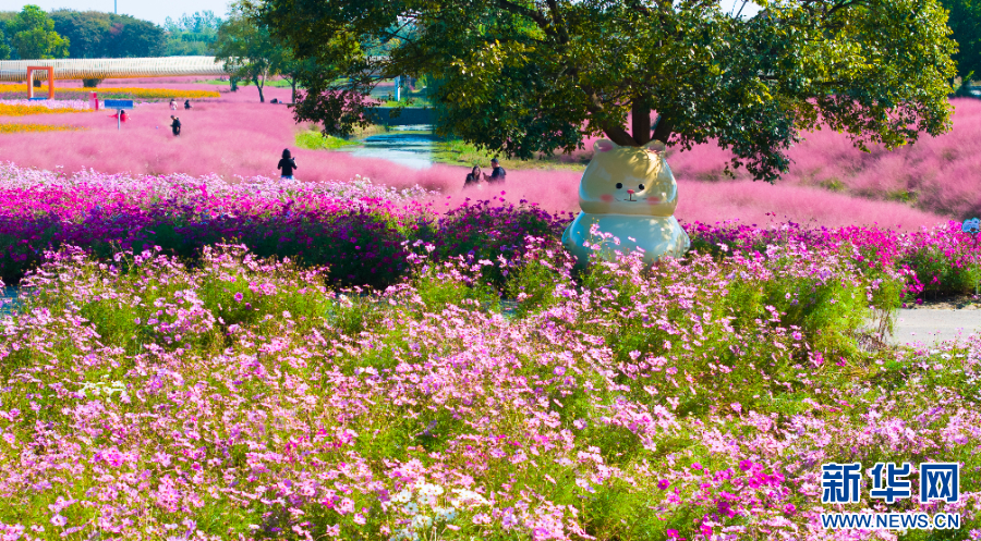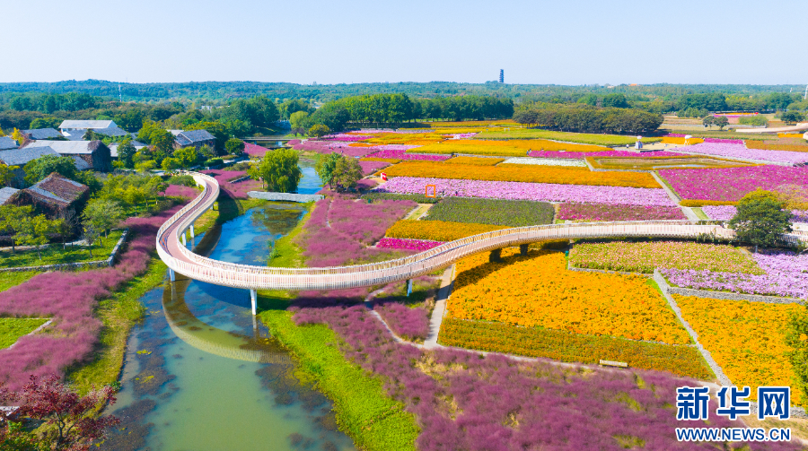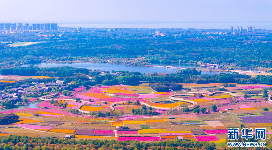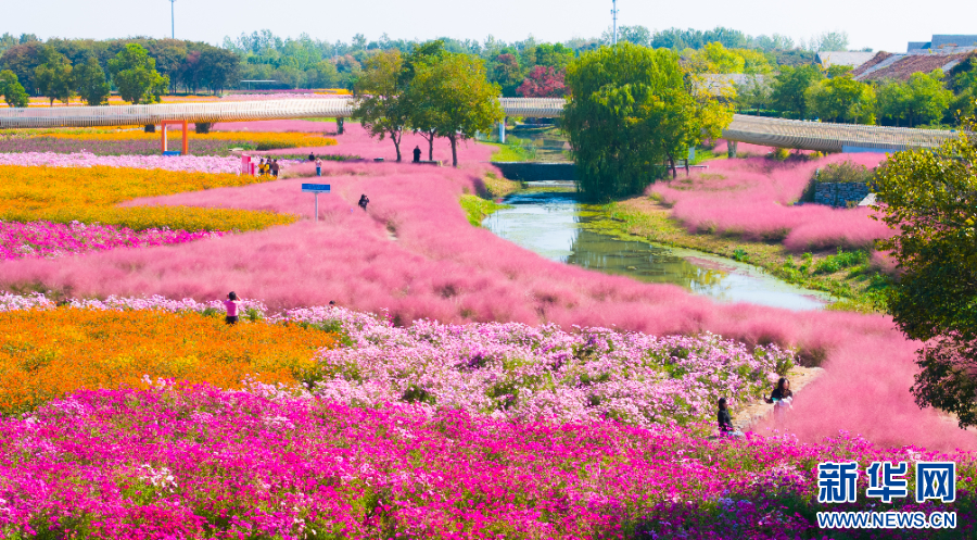 近日,在宿迁骆马湖国家级旅游度假区三台山花海,粉黛乱子草、百日草、醉蝶花、硫华菊等将大地装扮得五彩缤纷,游客仿佛置身于斑斓的油画之中,流连忘返。(崔雯雯 杨群)