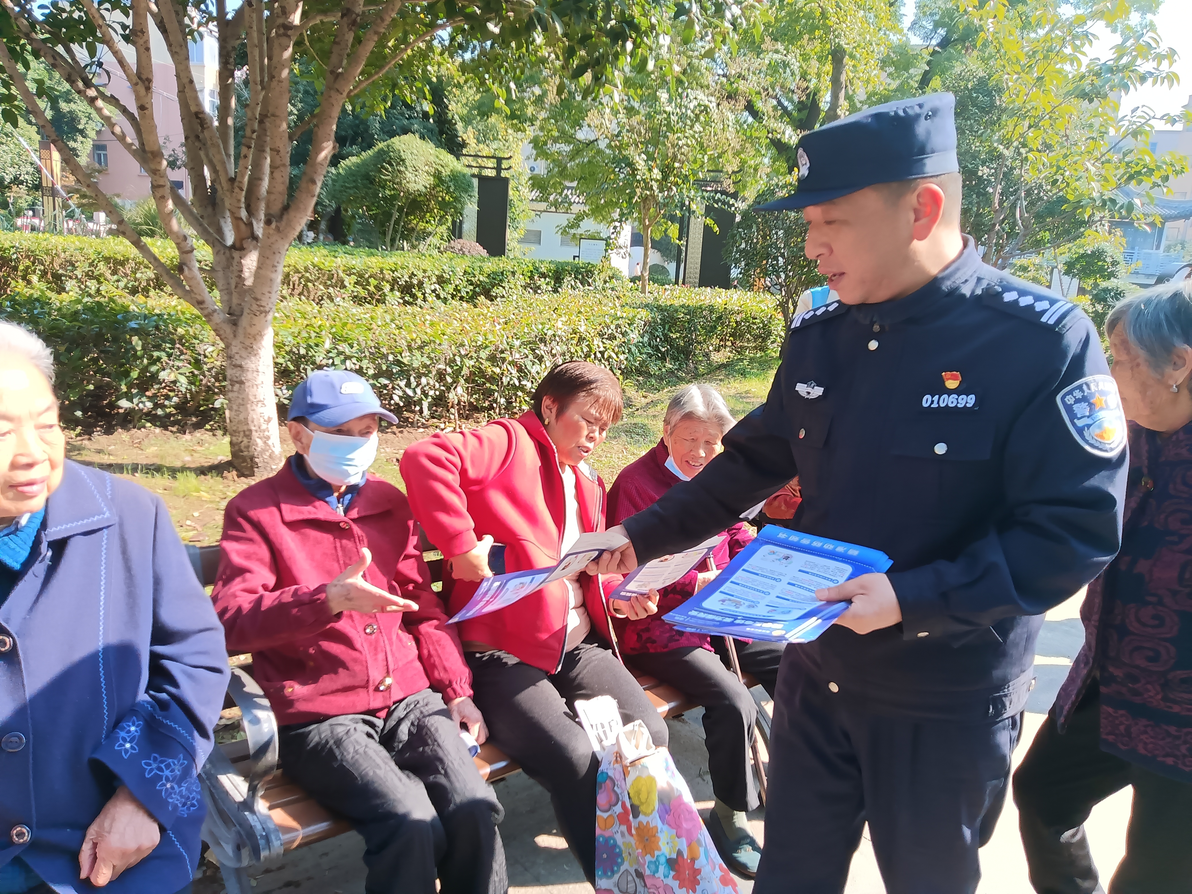 此外,社区政法网格长、民警马勇还带领江苏银行的工作人员,在活动现场向居民开展普法宣传,面向到场的老年朋友们,重点宣传预防电信网络诈骗安全常识。社区的各位网格员们也穿起了网格员蓝马甲,在现场分发安全感宣传册页,介绍“社工就是网格员”的服务内容,想法设法提升居民对网格化服务管理工作的知晓率和满意率。
