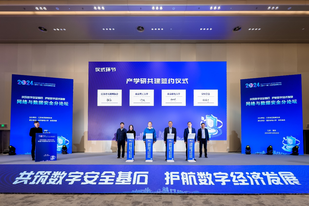此外,在会议现场,还举办了产学研共建签约仪式活动,江苏省互联网协会副秘书长张庆、南京理工大学江苏省智能交通与车联网工程研究中心副主任许波、南京邮电大学信息化建设与管理办公室主任倪晓军、江苏安恒网络安全有限公司总经理杨益中代表四家单位上台签约。未来,各方将携手推动高校科技创新发展、企业科技成果孵化,以新质生产力推动数字安全产业高质量发展。