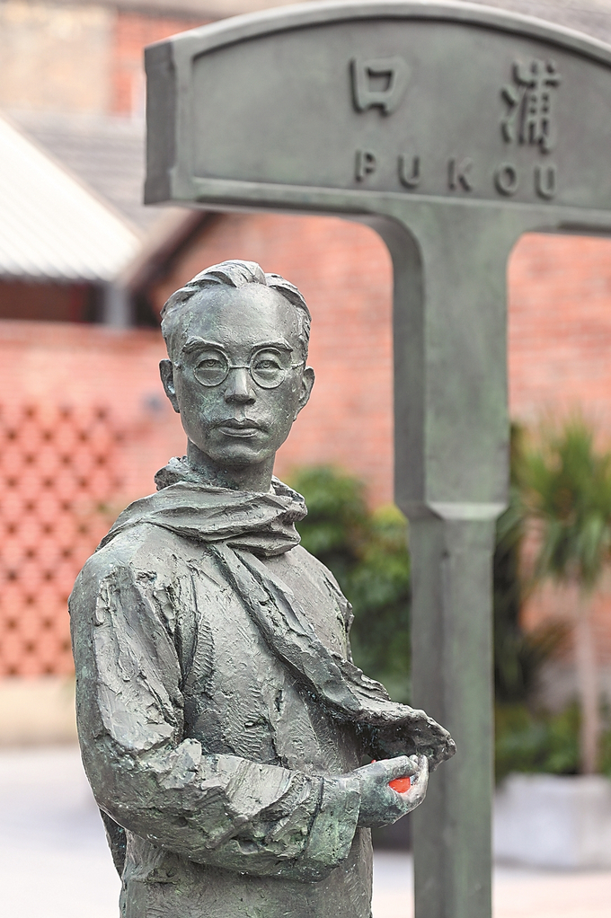 在“背影咖啡馆”,游客可以买到和《背影》相关的文创产品。街区小广场上,由雕塑家陈建华创作的朱自清雕塑是游客们不会错过的“打卡点”:面容清癯的朱自清身穿长衫,裹着围巾,左手提行李箱,右手捧着橘子。朱自清的孙子朱小涛撰写的雕塑铭文,向人们讲述着《背影》蕴含的亲情。