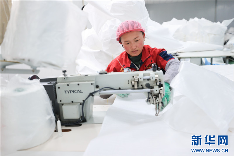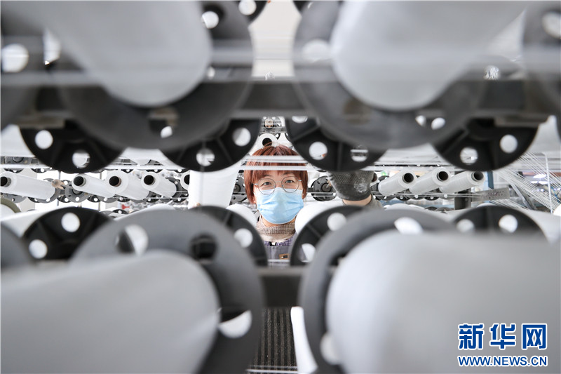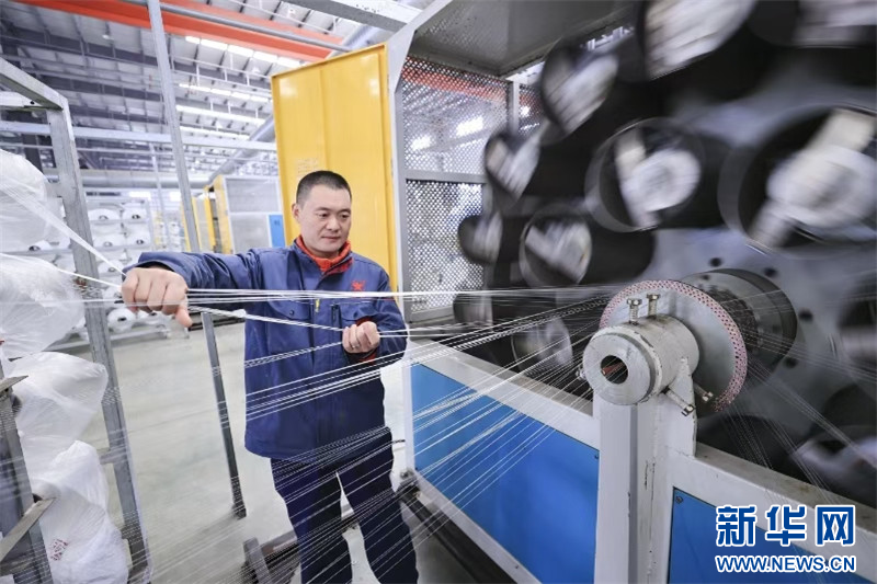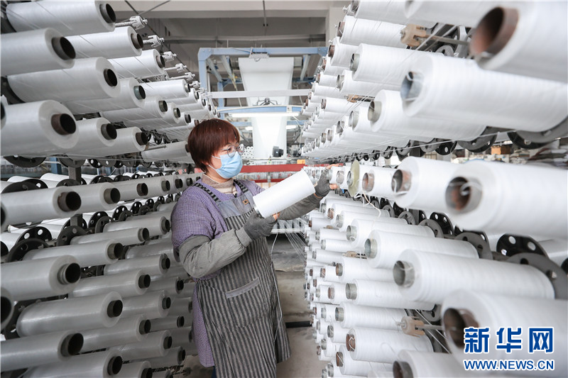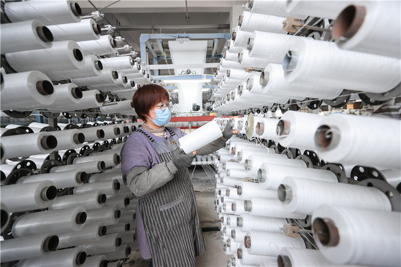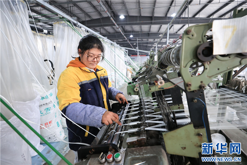 在连云港市赣榆高新区一塑料编织企业,工人在生产线上忙碌。
