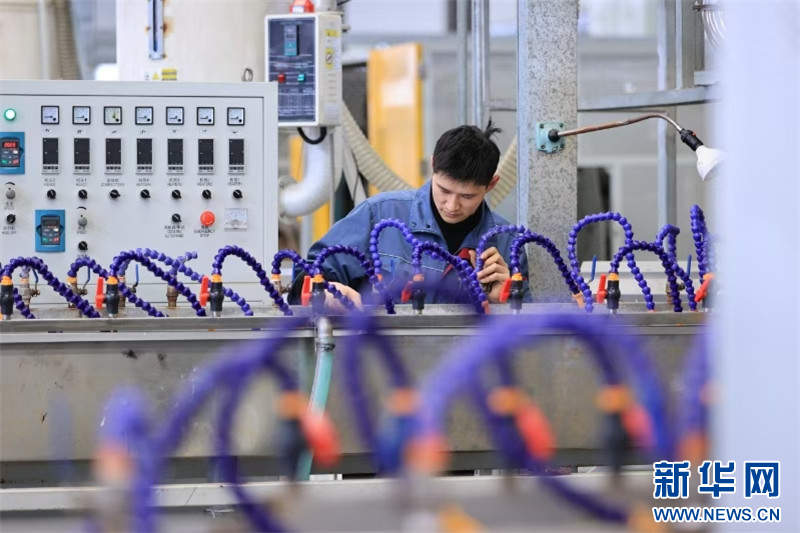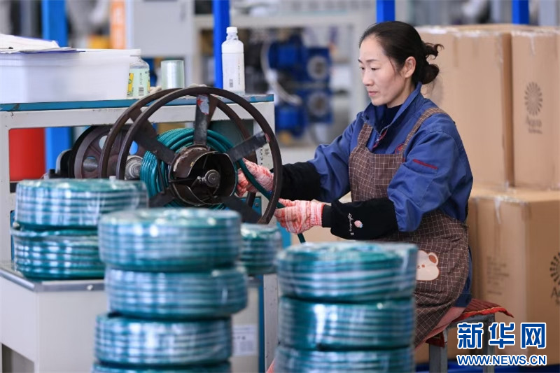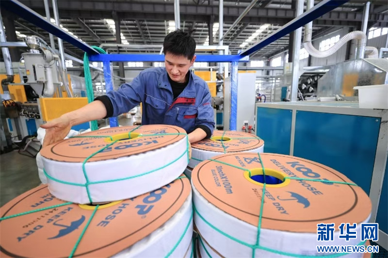 在连云港市赣榆高新区一家管材制品出口企业,工人在生产线上忙碌。
