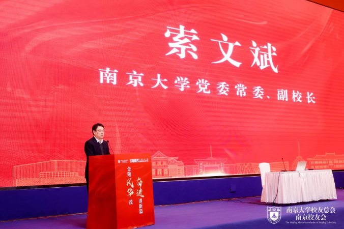 南京大学党委常委、副校长索文斌发表致辞,他强调了当前科技革命和产业变革的迅猛发展,以及南京大学在这一背景下的办学理念和发展目标。他呼吁校友们积极参与科技创新和产业发展,共同为社会贡献智慧与力量。