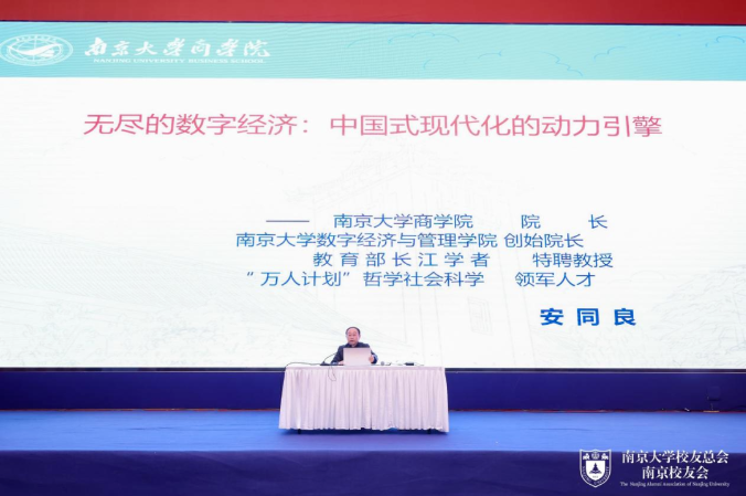 南京大学商学院院长、南京大学数字经济与管理学院创始院长安同良做了题为《无尽的数字经济:中国式现代化的动力引擎》的分享,主要讨论了数字经济的发展趋势、特点以及对世界经济的影响。他从历史和现实的角度出发,分析了数字经济的兴起背景,强调了中国在数字经济领域取得的成就和面临的挑战。同时也探讨了数字经济对传统经济模式的冲击,以及未来数字经济可能带来的社会变革。