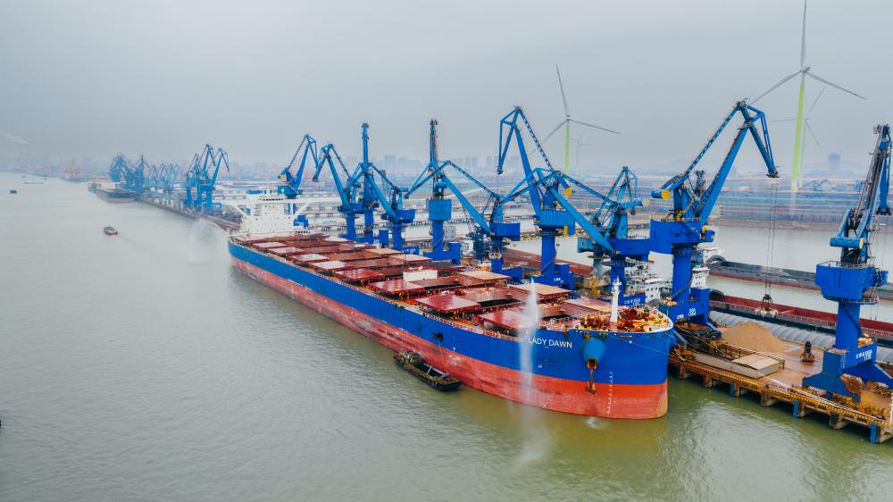 新华网南京2月14日电(记者杨绍功)13日,从圭亚那首都乔治敦装载11万吨“铝土矿+锰矿”的CAPE型船舶“光明女神”抵达靠泊江阴港口集团码头,这是首艘装载圭亚那铝土的船舶矿抵达江阴港,标志2025年江苏首条“一带一路”新外贸航线正式开通。