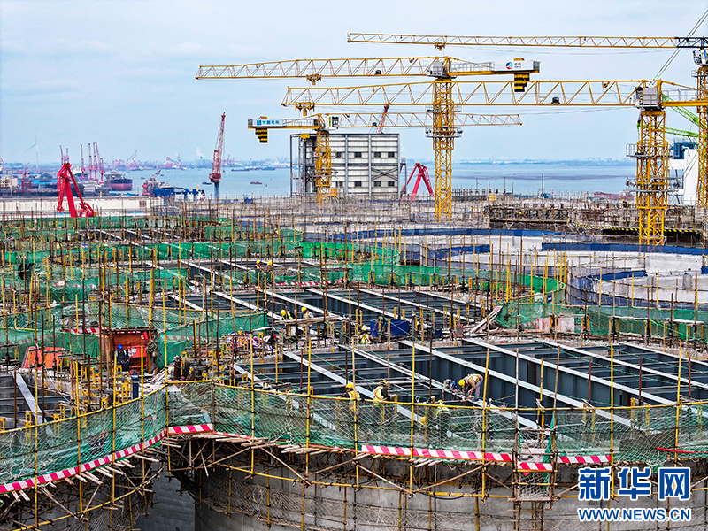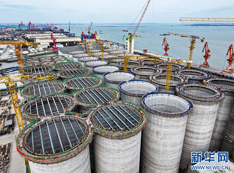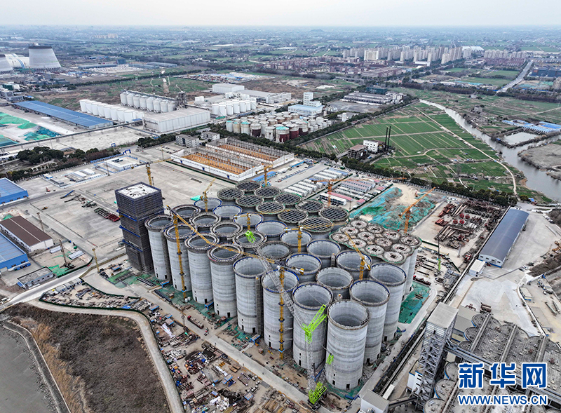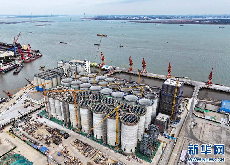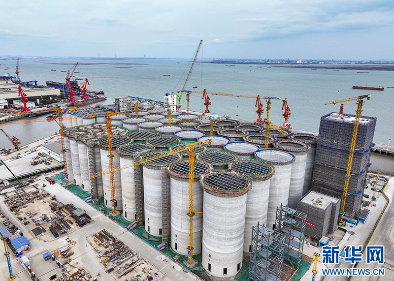 2月20日,在位于江苏省靖江市的中粮靖江码头仓储物流项目现场,中建八局的建设者正在加快项目建设,确保项目按照序时进度推进。