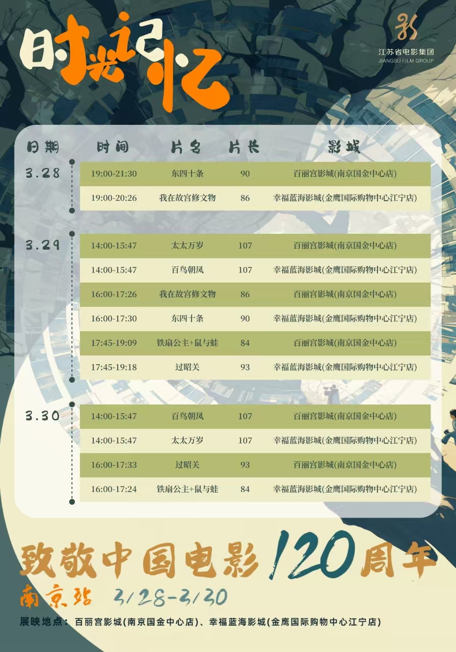 从1905年《定军山》的惊鸿一瞥,到2025年银幕上绽放的万千气象,中国电影跨越时光长河,以光影雕刻民族记忆。为致敬中国电影诞生120周年,根据江苏省电影局部署安排,由江苏省电影集团精心策划的“时光记忆”艺术电影展映将于3月28日在南京启幕,为期待已久的影迷们带来经典与新作的交响,完成一场跨越时空的光影对话。