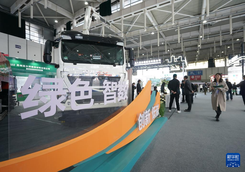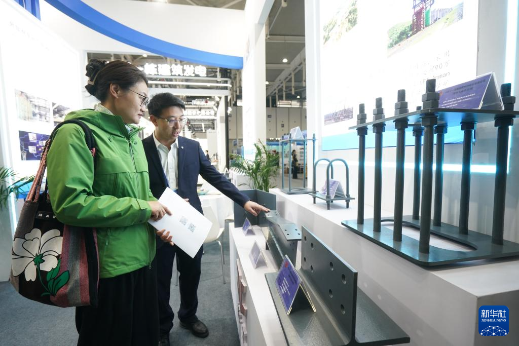 4月1日,在2025江苏绿色低碳建筑国际博览会上,参展的中铁十一局第七工程有限公司工作人员(右)向参观者介绍建筑新材料。