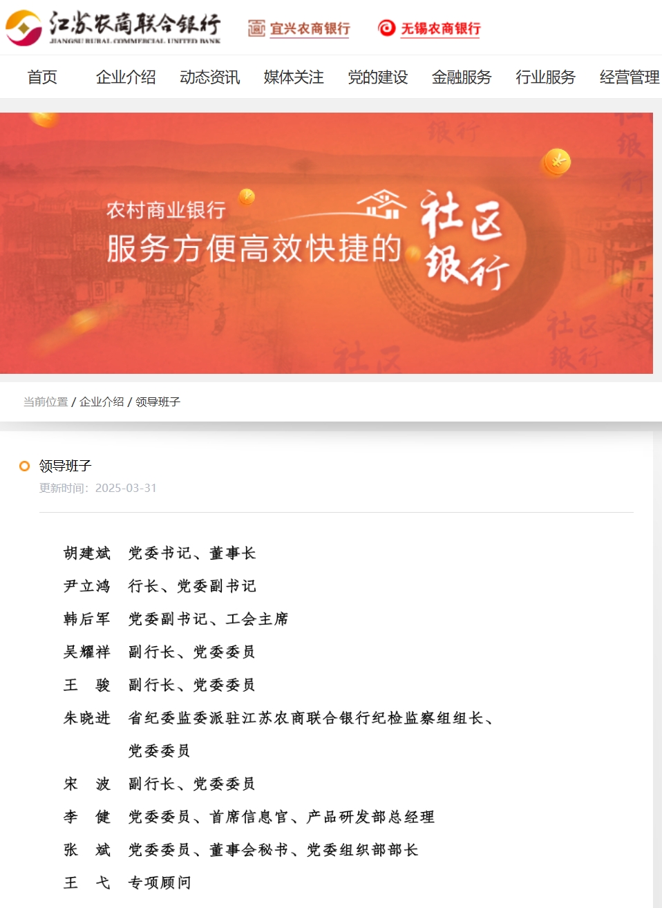 近日,江苏农村商业联合银行官网“领导班子”一栏显示,胡建斌已任该行党委书记、董事长,尹立鸿已任行长、党委副书记。至此,江苏农商联合银行这个新组建的省属国有银行,领导班子尘埃落定。