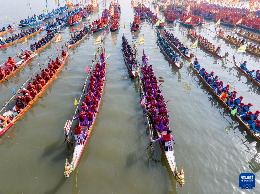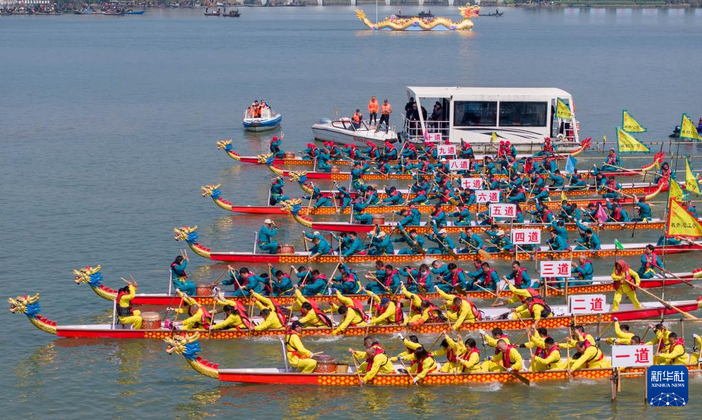 4月6日,龙船行驶在湖面上(无人机照片)。
