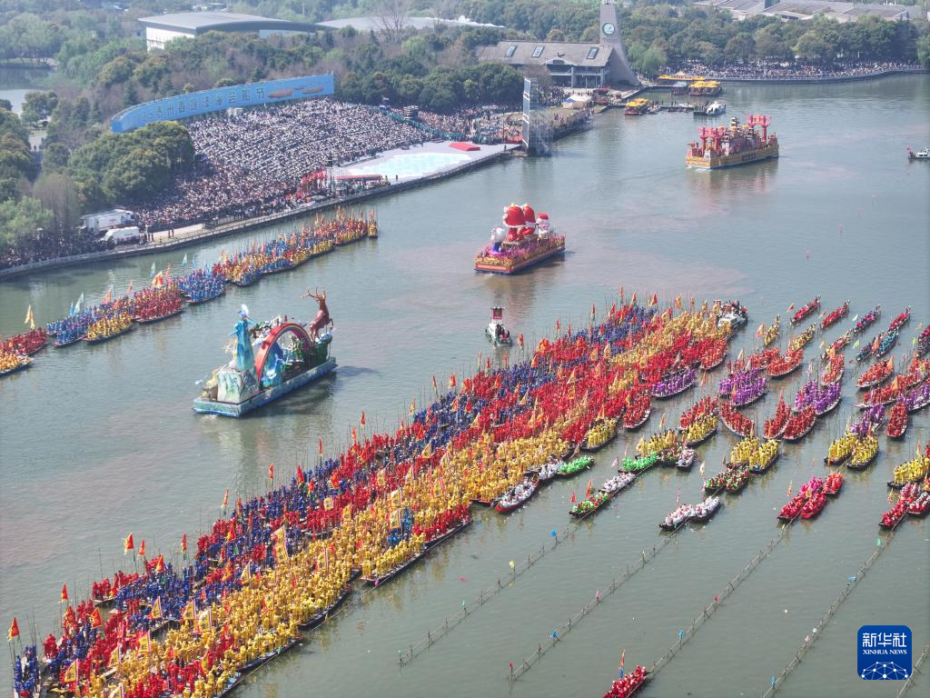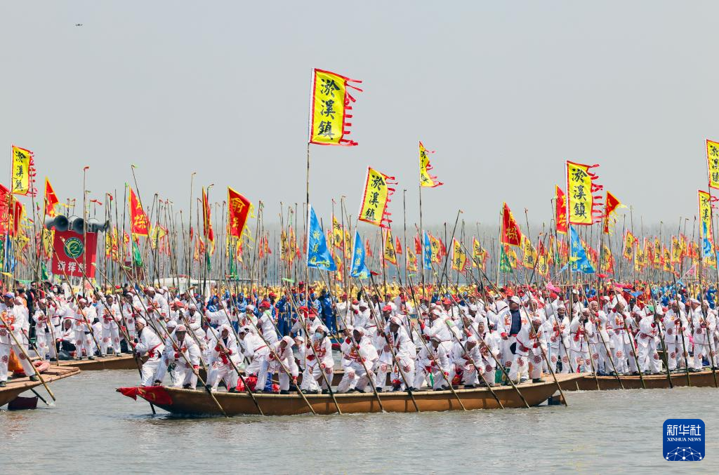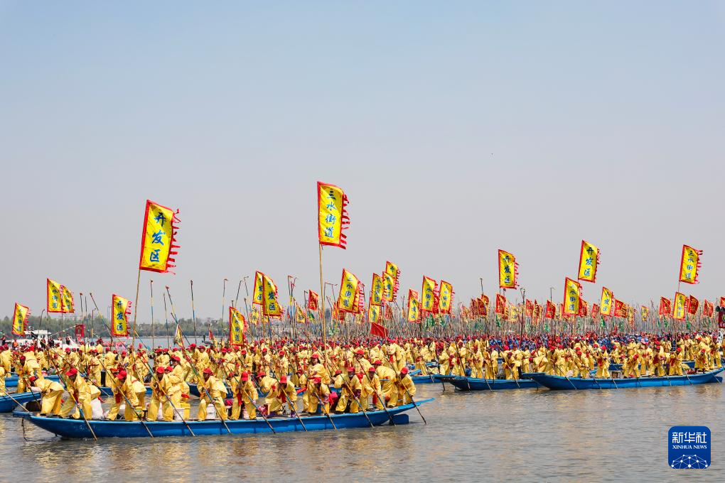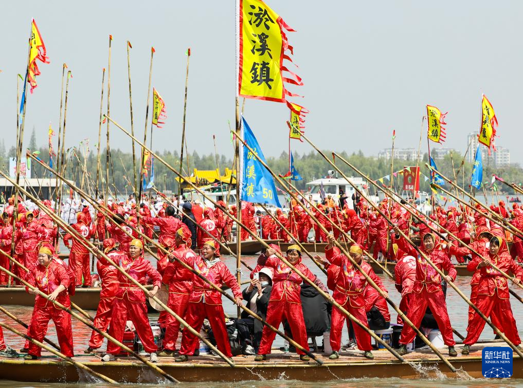 当日,2025泰州姜堰溱潼会船在江苏省泰州市姜堰区溱湖国家湿地公园开幕,五百多条各式船只和上万名会船选手飞篙走桨、弄潮击浪,演绎历久弥新的民俗画卷。
