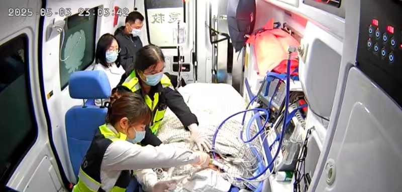 起初,车内心电监护仪的滴答声与呼吸机的运转声交织,患者生命体征平稳,急救人员紧绷的神经稍稍放松,但他们的目光始终未曾离开监测屏幕。然而,当距离当地医院仅1小时左右路程时,心电监护仪突然发出尖锐刺耳的报警声,仿佛是死神敲响的警钟。赵芳芳猛地起身,目光紧紧盯着屏幕——血氧饱和度正以肉眼可见的速度跌破90%!“快,先负压吸痰!”她大声下令。张亚雯迅速抄起吸痰装置,动作娴熟却又小心翼翼地操作着。可吸痰结束后,血氧饱和度依旧没有明显的改善。赵芳芳的额头渗出细密的汗珠,凭借多年的院前急救经验,她果断调整呼吸机参数。所有人都屏住呼吸,紧盯监护仪。终于,在漫长的等待后,血氧数值开始缓慢回升。