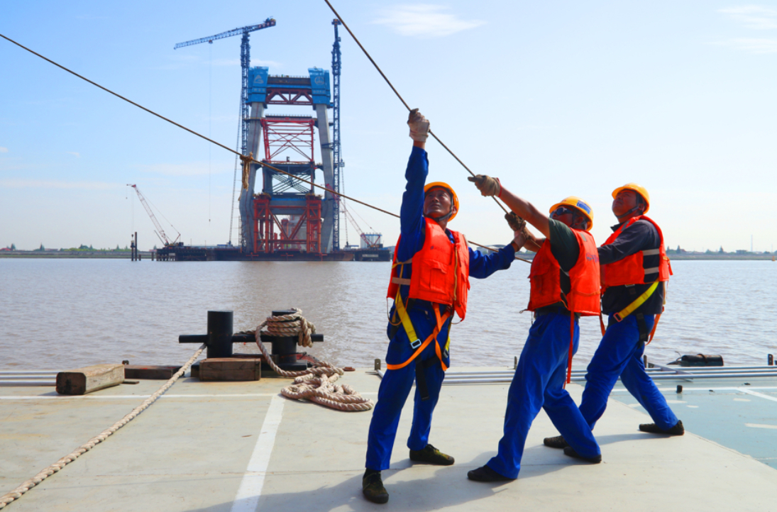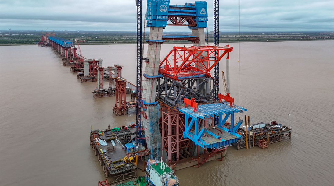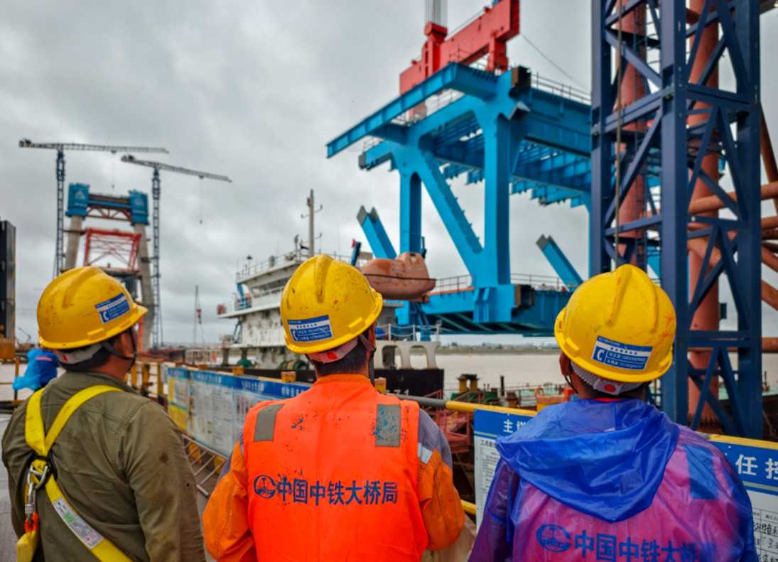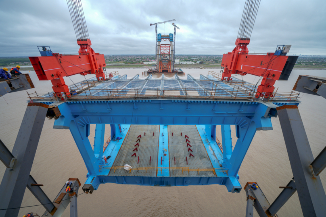 6月8日,中铁大桥局承建的沪渝蓉高铁V标崇启公铁长江大桥主通航孔桥首吊钢梁顺利架设完成。