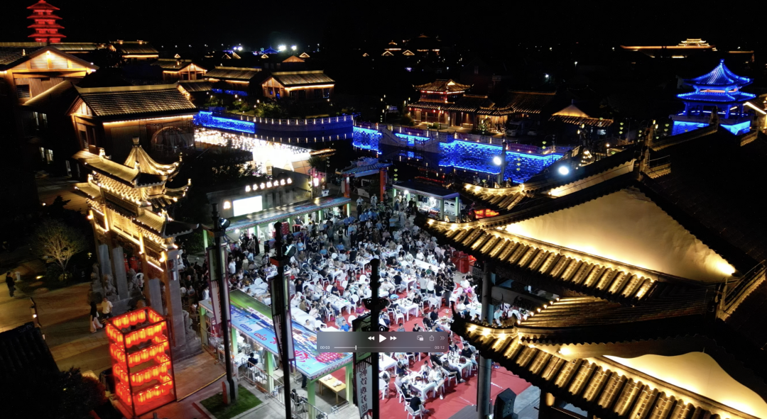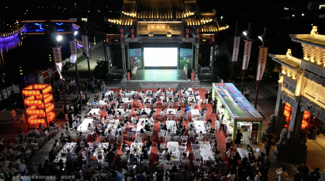 栟茶古镇中市街茗海戏楼,璀璨灯光与烧烤香气交织。绚丽的灯光秀随着进球节奏变换,将古镇夜空装点得格外夺目,500多名观赛者在美食美酒中共同见证南通队四次激动人心的进球瞬间。