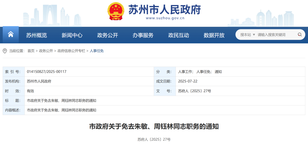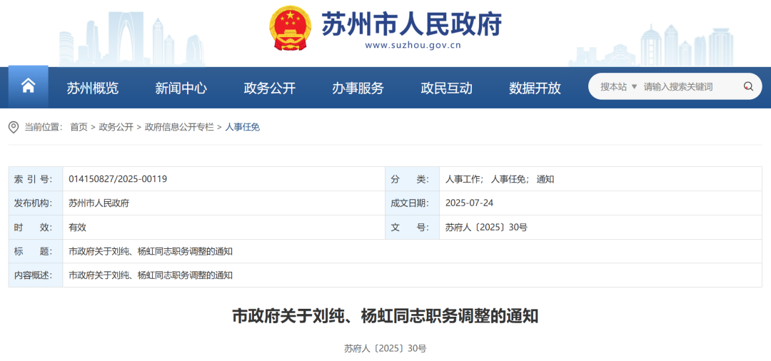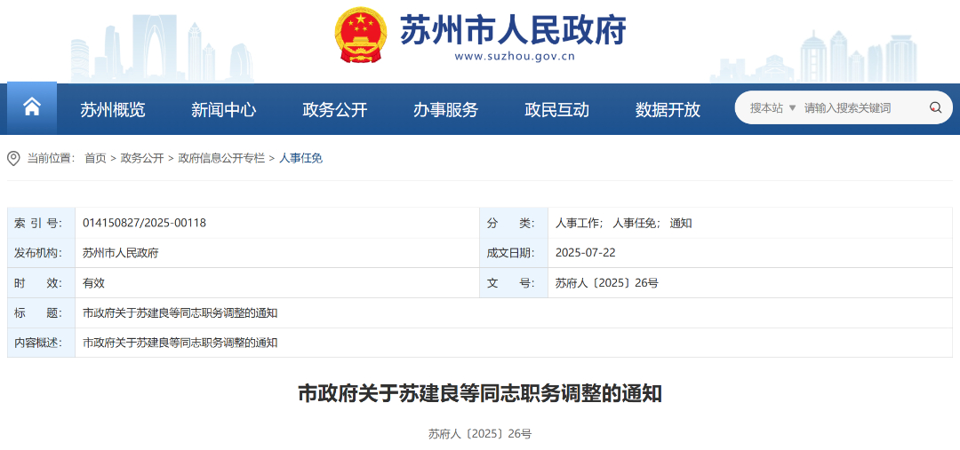 日前,苏州市人民政府网站公布一批人事调整。