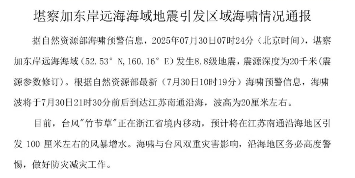 江苏省自然资源厅30日13时发布堪察加东岸远海海域地震引发区域海啸情况通报:
