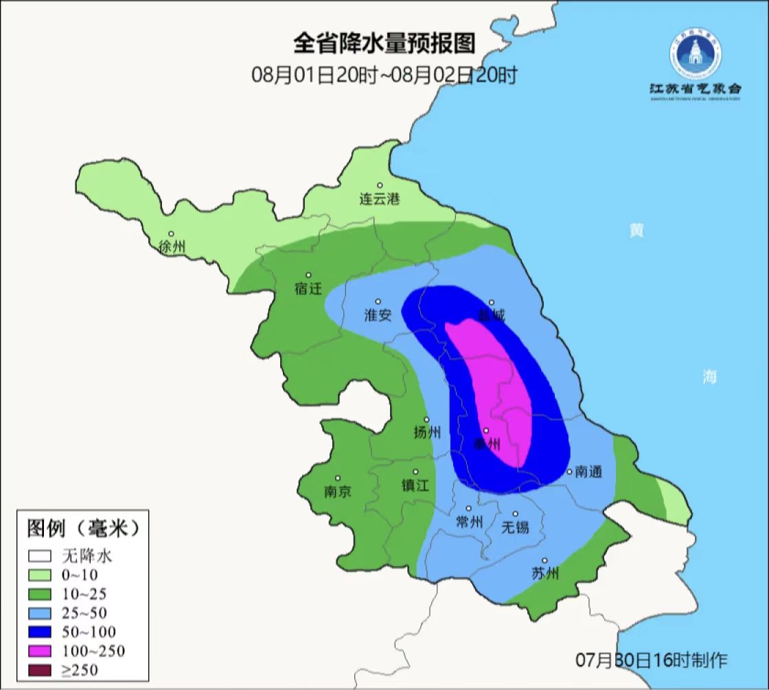 江苏气象最新发布台风警报、暴雨警报:今年第8号台风“竹节草”(强热带风暴级)的中心15时位于距离上海市浦东新区南偏东方向约65公里的海面上,也就是北纬30.7度、东经121.8度,中心附近最大风力有10级(25米/秒),中心最低气压为978百帕。预计,“竹节草”将以每小时10-15公里的速度向西偏北方向移动,强度变化不大。受其影响,30日夜里-8月1日我省大部分地区有较强风雨,陆上最大阵风可达7-9级,江河湖库及沿海海面可达9-11级。