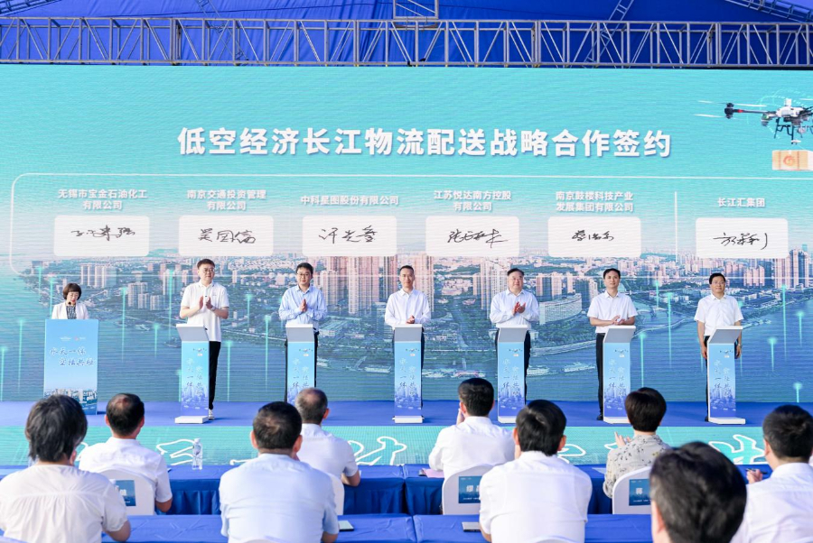 为服务升级“再添柴”,仪式现场,南京海事局、南京市下关滨江商务区管委会与长江汇集团共同签署了“‘江翼达’低空飞行基地合作共建协议”,政企协同将助力基地建设运营;长江汇集团与中科星图股份有限公司、江苏悦达南方控股有限公司、南京交通投资管理有限公司、南京鼓楼科技产业发展集团有限公司、无锡市宝金石油化工有限公司5家企业签署低空经济长江物流配送战略合作协议,共同拓展低空物流应用潜力。