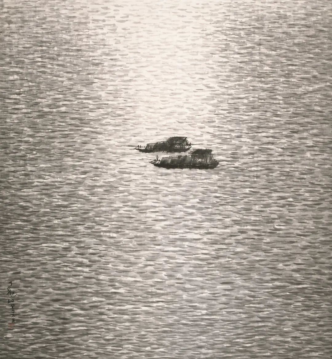 以“呓墨,墨异”为题,是对这七位艺术家精神内核最精准的注脚。“呓墨”,如一层氤氲的薄纱,笼罩着整个艺术探索的历程。它捕捉的是创作时非理性的、直觉的、梦境般的表达状态:丁观加醉心于江涛的韵律,笔下的墨彩交融仿佛水神的即兴吟唱;杜大恺在几何色块与平凡物象间,编织着理性与诗意交织的静默梦语;程大利笔下的山水浑朴之境,何尝不是一场澄怀观道的悠长冥想?这“呓”,是艺术家们潜意识的低徊,是直觉的奔涌,是精神在墨色疆域里的自由游牧。