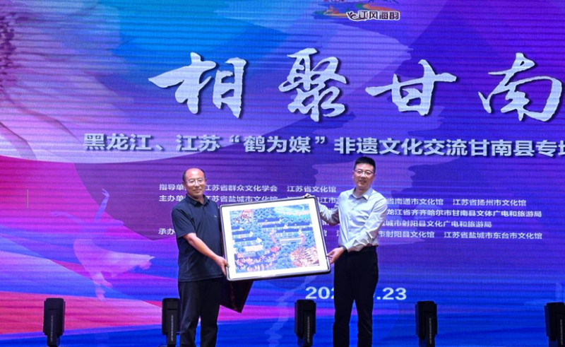 9月23日,由江苏省群众文化学会、江苏省文化馆联合指导,江苏省盐城市文化馆、江苏省镇江市文化馆、江苏省南通市文化馆、江苏省扬州市文化馆、江苏省泰州市文化馆、江苏省连云港市文化馆、黑龙江省齐齐哈尔市甘南县文体广电和旅游局、江苏省盐城市东台市文化广电和旅游局、江苏省盐城市射阳县文化广电和旅游局共同主办,黑龙江省齐齐哈尔市甘南县文化馆、江苏省盐城市射阳县文化馆、江苏省盐城市东台市文化馆执行承办的“江风海韵”沿江沿海城市文艺联盟“相聚甘南”黑龙江、江苏“鹤为媒”非遗文化交流甘南县专场巡演在甘南拉开帷幕。
