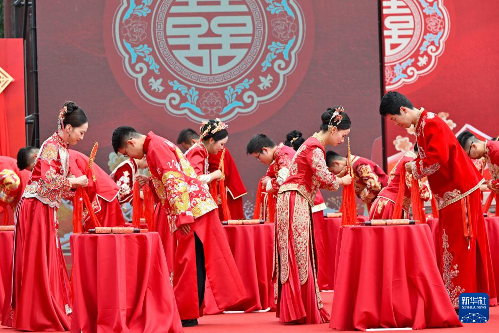 9月29日,中铁二十局在江苏苏州甪直古镇举办“姑苏缔良缘 携手向未来”青年职工集体婚礼。26对新人身着传统婚服,共读婚书,喜结连理。