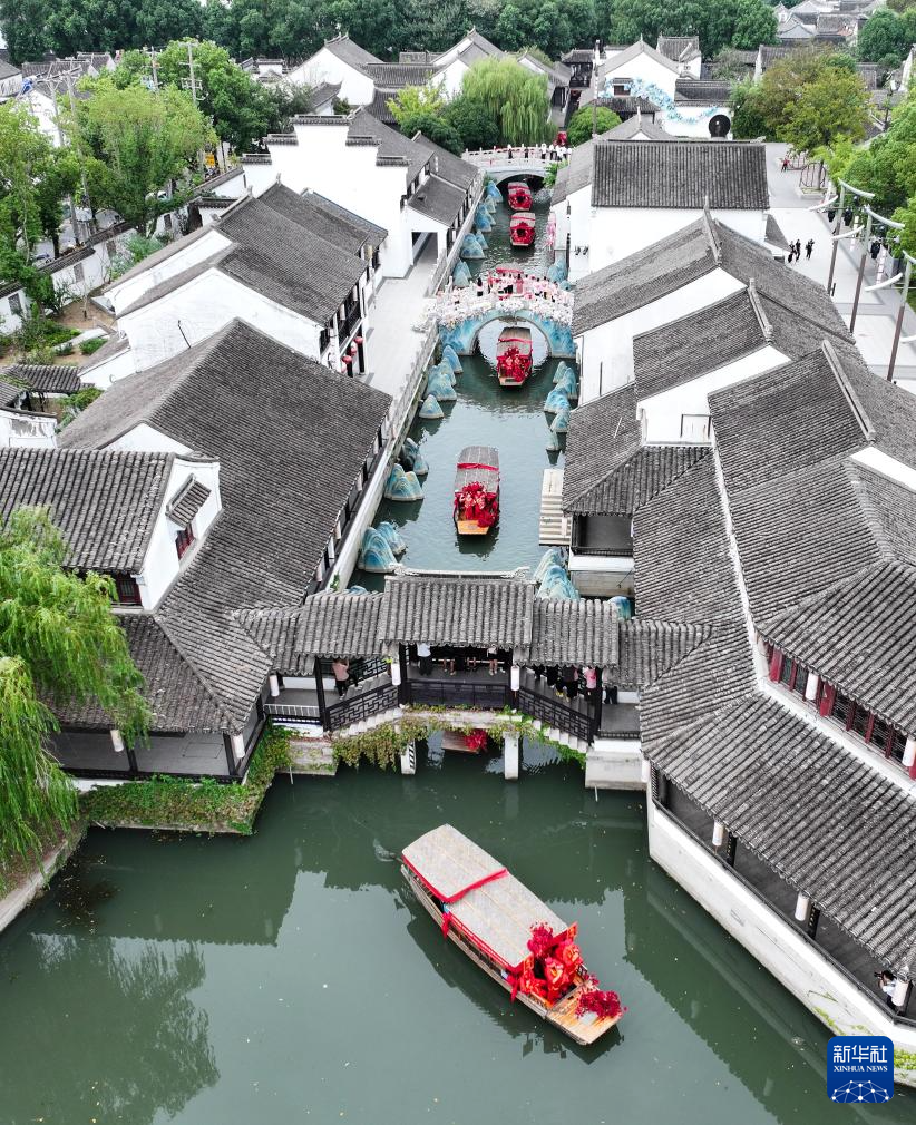 9月29日,新人乘船游览甪直古镇(无人机照片)。