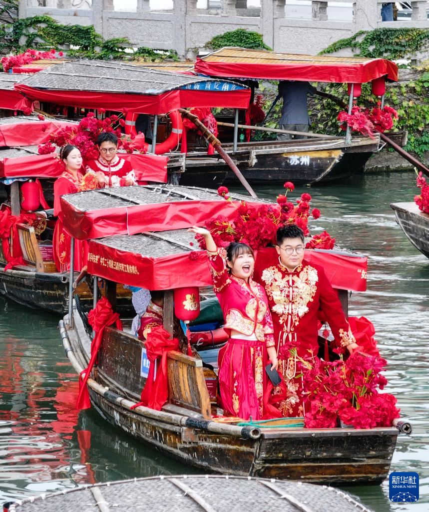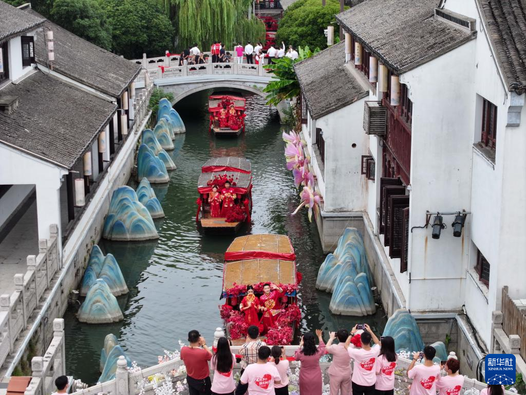 9月29日,新人在甪直古镇参加集体婚礼(无人机照片)。