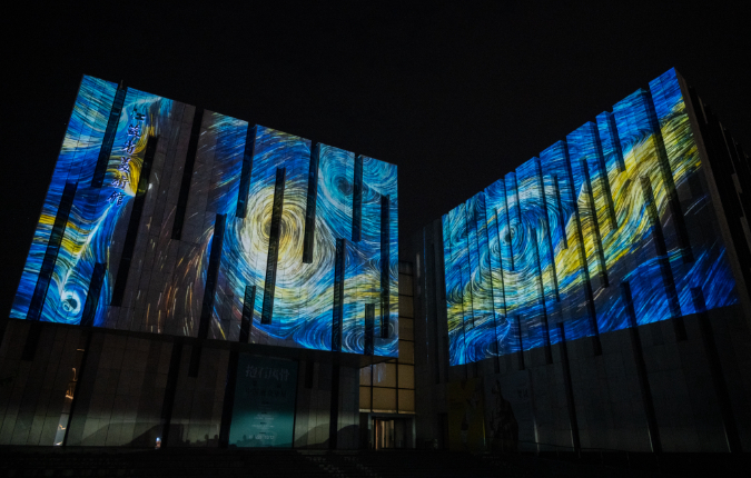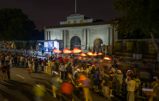 传统与潮流的碰撞,让长江路的夜晚更具吸引力,而分会场活动同样亮点纷呈。以“美学光影”为主题,江苏省美术馆新馆与陈列馆双馆联动,推出“国梦璀璨・月韵华章”美术馆之夜活动,打造穿越时空的艺术漫游。其中,在陈列馆有文艺演出精彩呈现,新馆则举办了“月满映华诞”光影秀,以建筑为幕,以月色为引,将千年文脉与现代科技交融,用灯光美学焕活建筑空间。