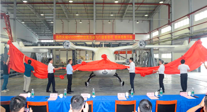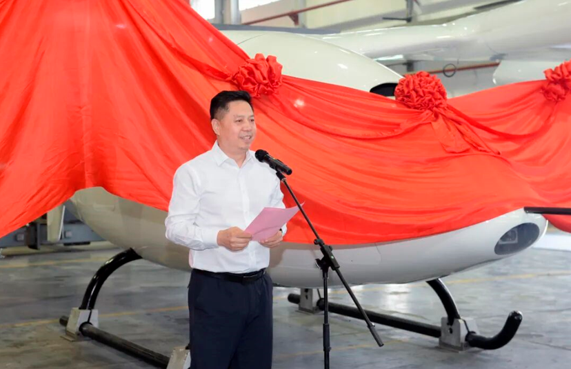 随着前期各项环节的有序推进,现场氛围逐渐推向高潮,V1000首架机机体结构下线揭幕这一核心环节正式开启。参加活动的几位嘉宾共同为新机机体揭幕,现场掌声雷动,标志着V1000项目正式迈出阶段性关键一步。