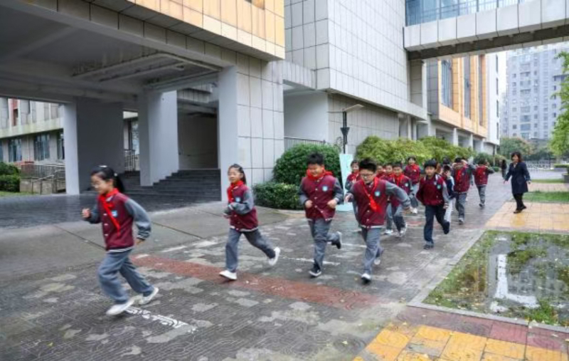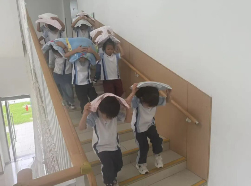镇江市中山路中心幼儿园中建园区组织全体师生开展地震应急疏散演习。急促的警报声在园内响起,孩子们在老师引导下,迅速拿起身边小枕头、软垫护住头部;待“强震”暂歇,又在老师带领下,保持弯腰低身、护头姿势,沿预定路线快速有序地从各活动室撤离至室外安全地带。