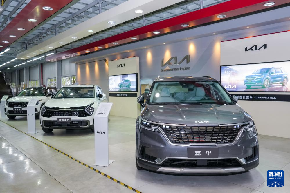 位于中韩(盐城)产业园的江苏悦达起亚汽车有限公司内展示的汽车(10月16日摄)。