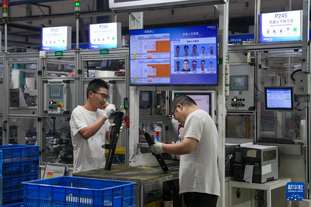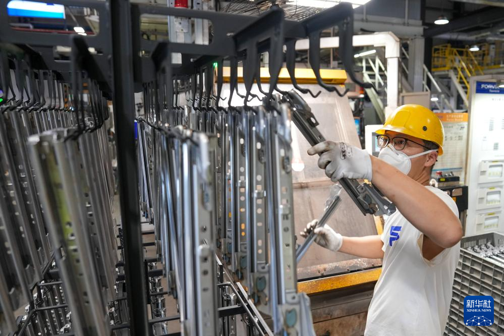 工人在佛吉亚(盐城)汽车部件系统有限公司汽车配件生产车间内工作(9月18日摄)。