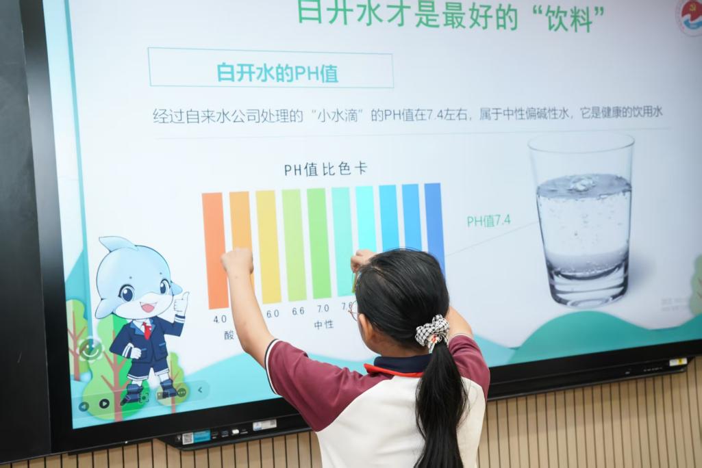 最令同学们感兴趣的,当属“水的酸碱度”测试环节。“润润讲师团”的老师为每位同学发放pH试纸,让大家亲手检测自来水、可乐、果汁等不同液体的酸碱度。当试纸在可乐中变为深红色,在自来水中呈淡黄色,在纯净水中接近无色时,现场瞬间化作一场精彩的“色彩变装秀”。同学们拿着试纸兴奋地与标准比色卡比对,不仅牢牢记住了pH值的含义,了解了健康饮用水的酸碱范围,更对“为何不能长期大量饮用酸性饮料”有了初步认知。